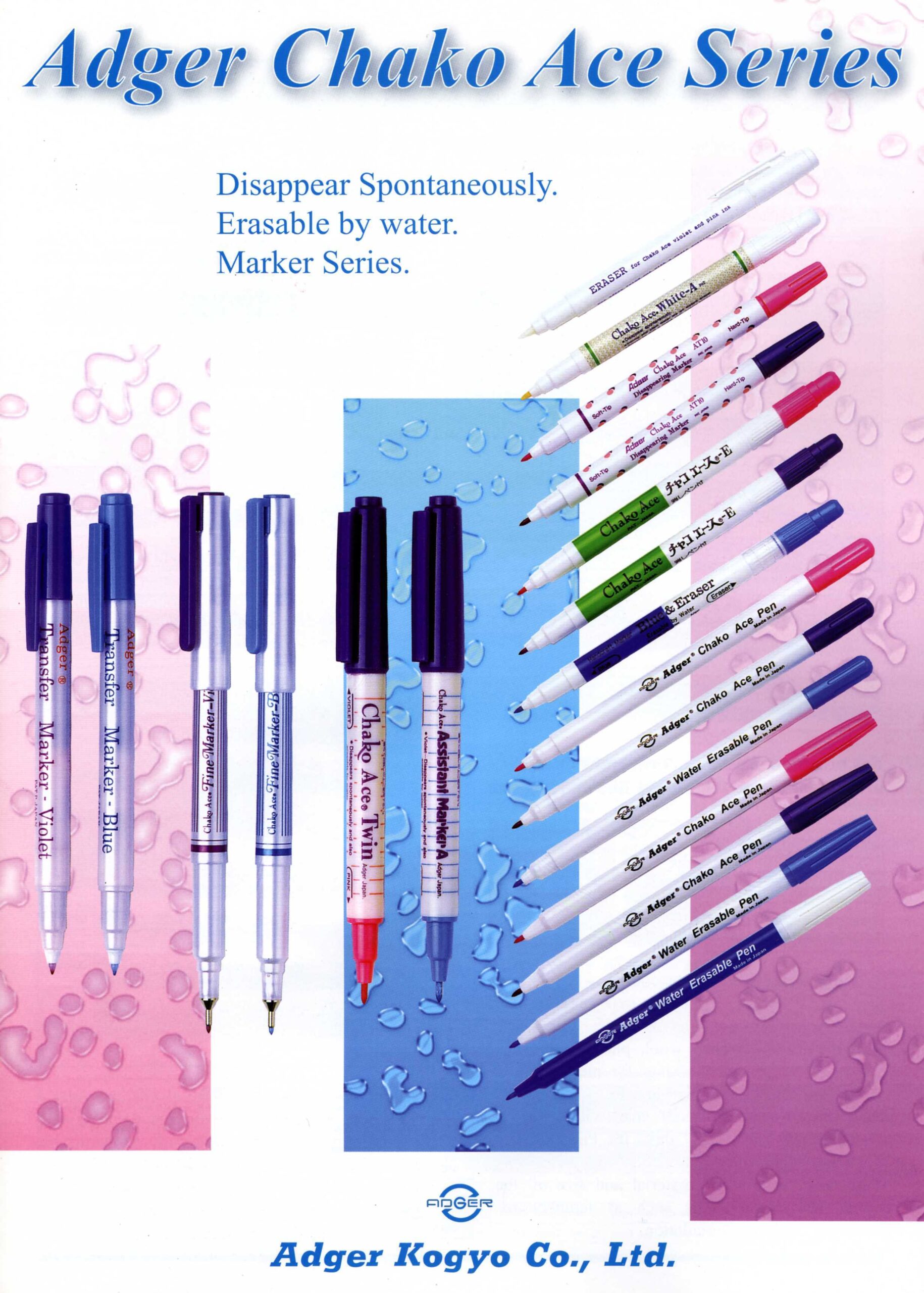 ADGER Chako Ace 消失筆記號筆-雙頭記號+消去 粉紅色消去雙頭:粉紅色在 2 – 7 天內會自行消失 紫色消去雙頭:紫色在 2 – 14天內會自行消失 藍色消去雙頭:沾水才會消失,不沾水不消失 記號消失的時間與使用的材質、氣溫、寫的方式有關 用清水擦拭可使記號消失 |